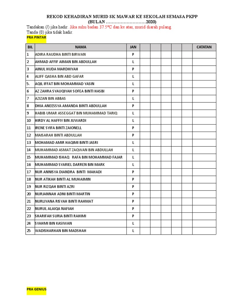 Borang Kehadiran Murid Ke Sekolah Semasa Pkpp 10ogos2020 Pdf